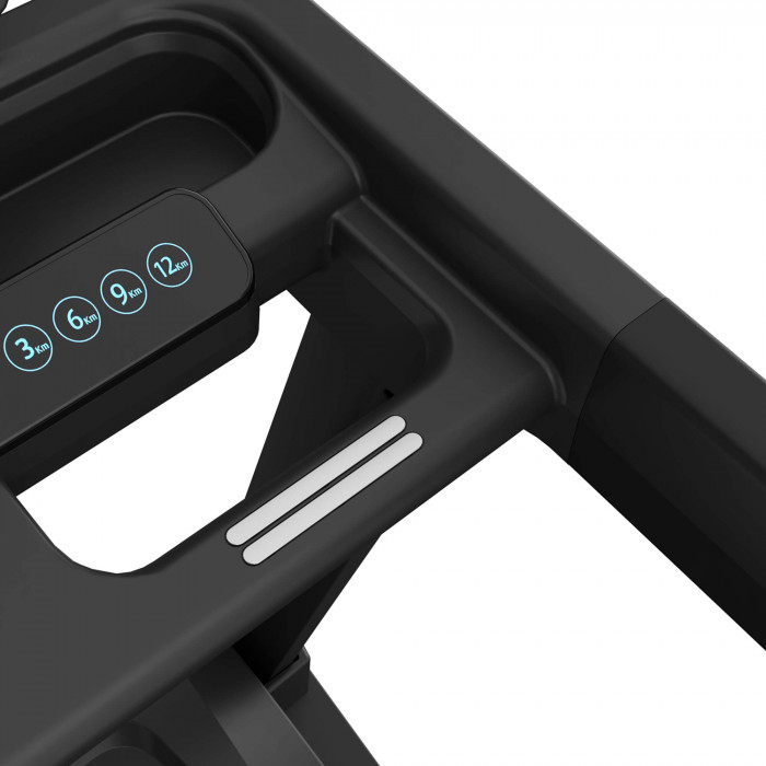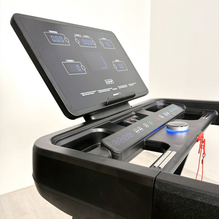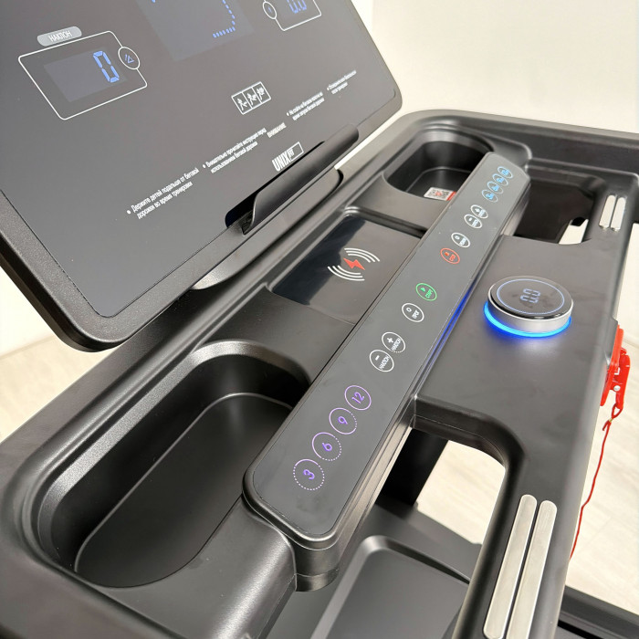 дополнительная консоль с кнопками быстрого выбора скорости, угла наклона, старт/стоп, выбор программ, режимы; умная кнопка-диммер с управлением: включение/выключение, увеличивается/уменьшается скорости и с отображением на дисплее: скорости, времени, расстояния, количество калорий, пульса, беспроводная зарядка для гаджетов