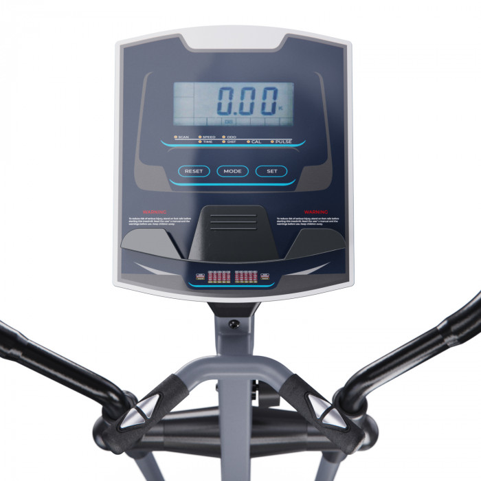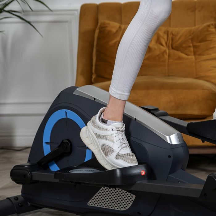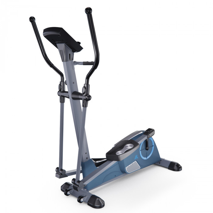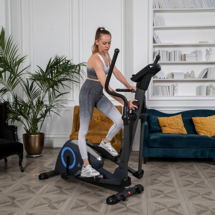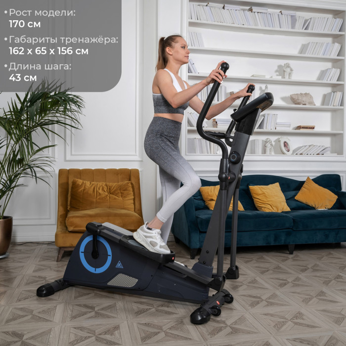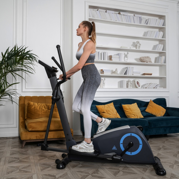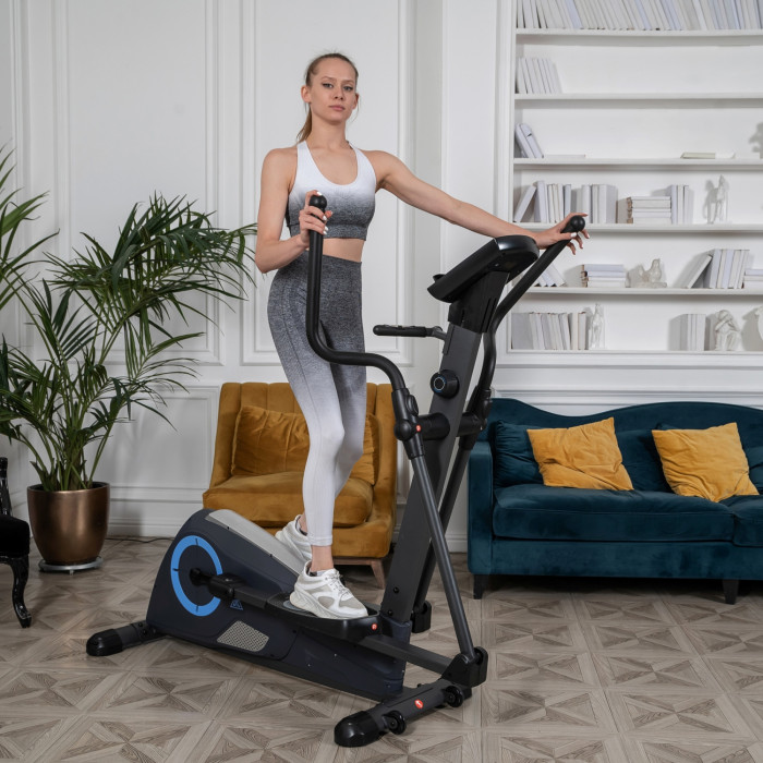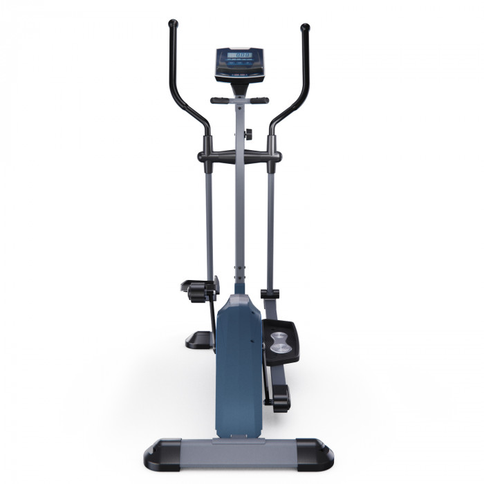 Эллиптический тренажер с задним расположением маховика для домашнего использования. Тренировка на эллиптическом тренажере - это прекрасная альтернатива бегу трусцой или ходьбе, с разницей в высоком сжигании калорий. Благодаря интенсивному движению рук верхние участки тела напрягаются, все тело укрепляется, повышается эффективность тренировки. Среднегабаритная модель с магнитной нагрузкой - система сопротивления с постоянным магнитом и тончайшей настройкой интенсивности. Регулировка нагрузки с помощью ручного привода на стойке тренажера. Консоль с монохромным LCD-дисплеем отображает все необходимые показатели во время тренировки. Измерение пульса осуществляется с помощью встроенных датчиков. Мощная рама тренажера, усиленная конструкция из стального профиля, позволит заниматься пользователю весом до 120 кг. Широкие педали с нескользящей вставкой. Транспортировочные колеса в передней части обеспечивают свободное перемещение тренажера по комнате. Задний стабилизатор с регулировкой положения на неровной поверхности.
