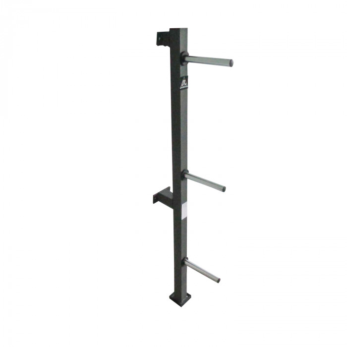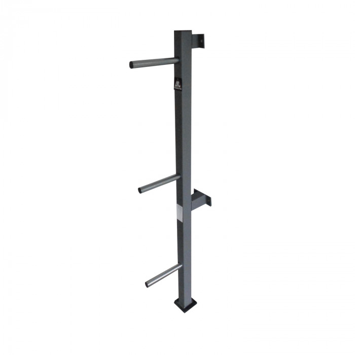Стойка располагается на полу, с упором на стену. Для дополнительной устойчивости прикручивается болтами. Компактно размещается в углу комнаты. Рекомендуем размещать снаряды сверху вниз, в порядке увеличения массы.