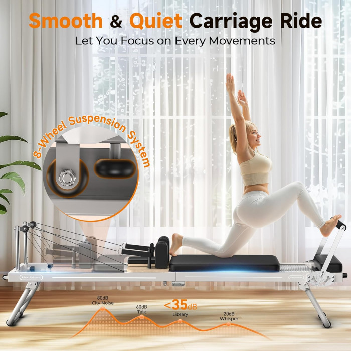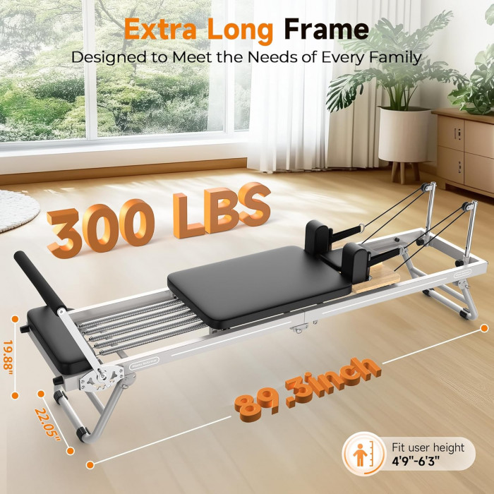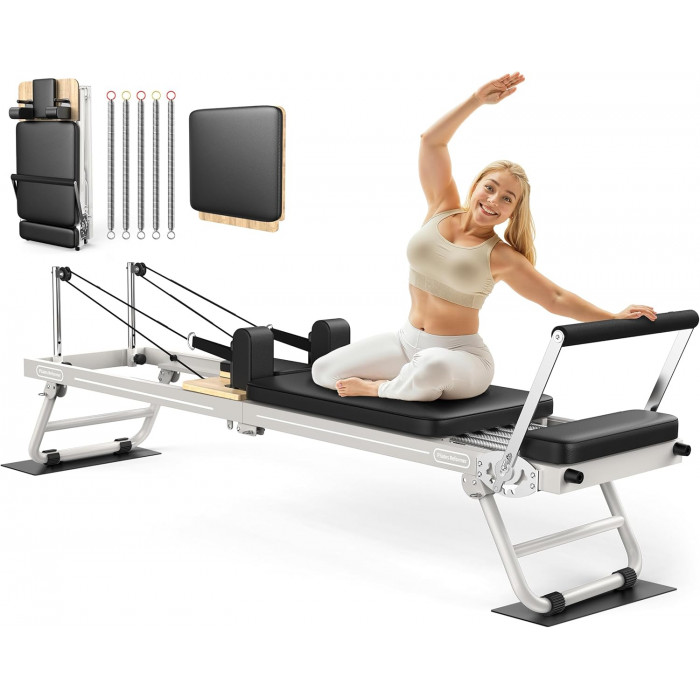 Основой реформера является надёжная пружинная система с пятью усиленными пружинами, обеспечивающая плавное и контролируемое сопротивление. Три уровня нагрузки (6,8 кг, 8,2 кг и 10 кг) и два уровня крепления — верхний и нижний — позволяют регулировать интенсивность занятий и выполнять широкий спектр упражнений, от растяжки до силовых тренировок.