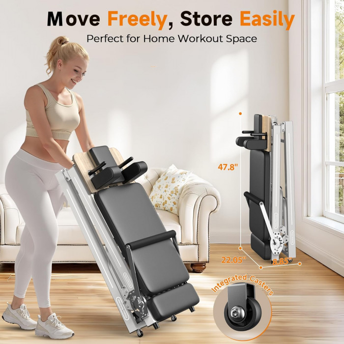 Благодаря складной конструкции реформер DFC PLT19X не занимает много места и идеально подходит для домашних тренировок. В сложенном виде он становится компактным и легко перемещается с помощью встроенных транспортировочных роликов, что упрощает хранение даже в небольшой квартире. Этот тренажёр сочетает качество, удобство и функциональность профессионального уровня, обеспечивая эффективные и комфортные занятия пилатесом в любых условиях.
