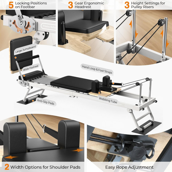 Реформер оснащён множеством регулировок, что позволяет легко подстроить его под особенности каждого пользователя. Пять уровней упора для ног, три положения подголовника и направляющих роликов, а также два варианта ширины плечевых упоров обеспечивают комфорт и правильное положение тела. Большая антискользящая платформа и прочные петли для рук и ног гарантируют стабильность и безопасность даже при активных тренировках.