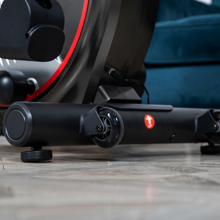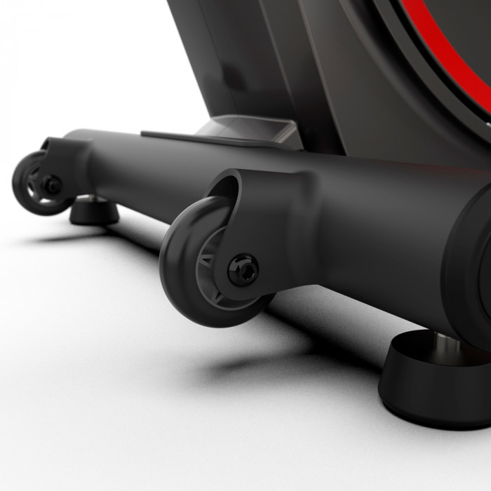Мощная рама тренажера, усиленная конструкция из стального профиля, позволит заниматься пользователю весом до 135 кг. Транспортировочные колеса в передней части обеспечивают свободное перемещение тренажера по комнате. Задний стабилизатор с регулировкой положения на неровной поверхности.