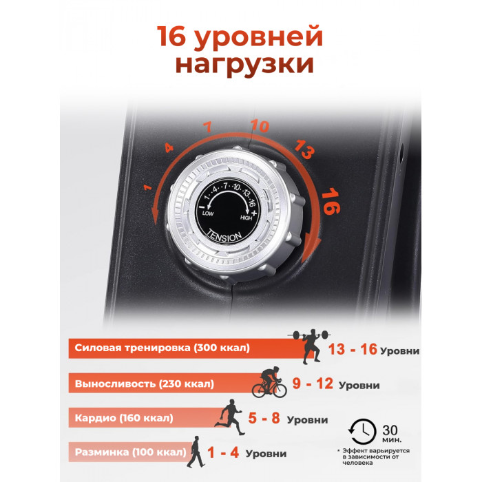 Магнитная система с механической регулировкой предлагает 16 уровней нагрузки, позволяя легко адаптировать интенсивность тренировки под индивидуальные цели и уровень подготовки, а вес маховика 3 кг способствует плавной и стабильной работе тренажёра, создавая комфортные условия для длительных и эффективных тренировок.