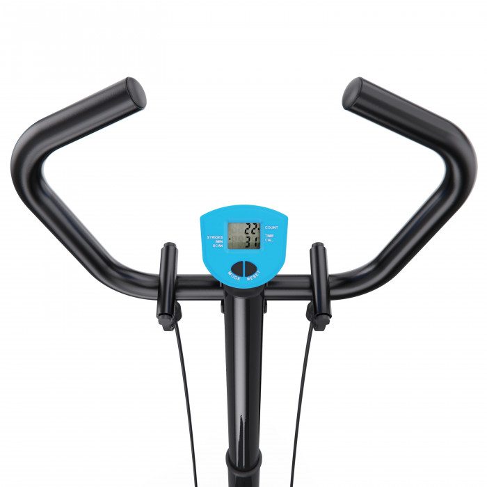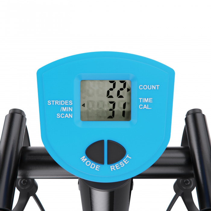 Монохромный LCD-дисплей отображает основные параметры тренировки: время, количество шагов, расход калорий, темп и функцию сканирования. Это помогает контролировать интенсивность занятий и отслеживать прогресс. Для работы дисплея используется 1 батарейка типа AAA (1.5 В) — в комплект не входит.