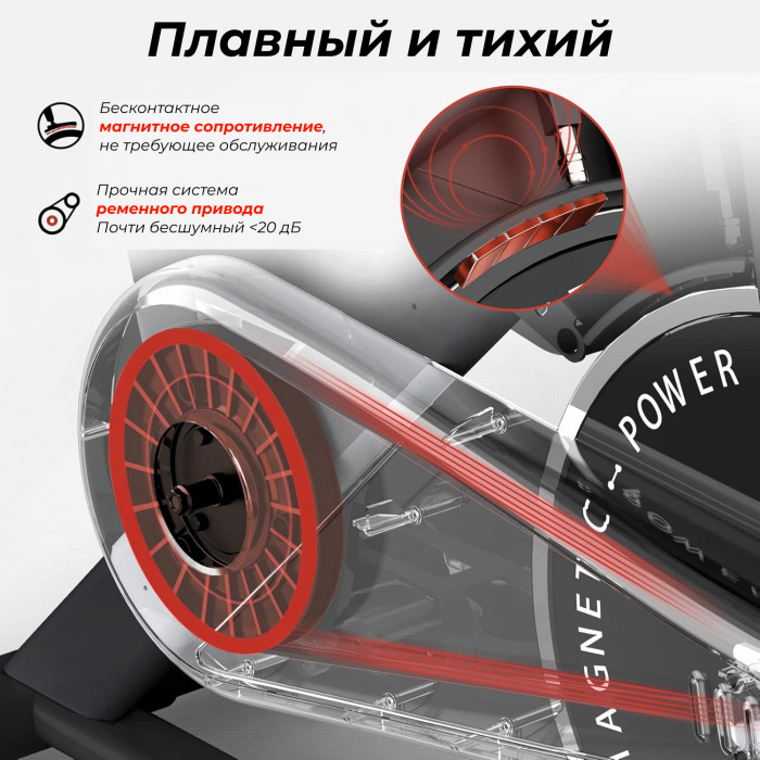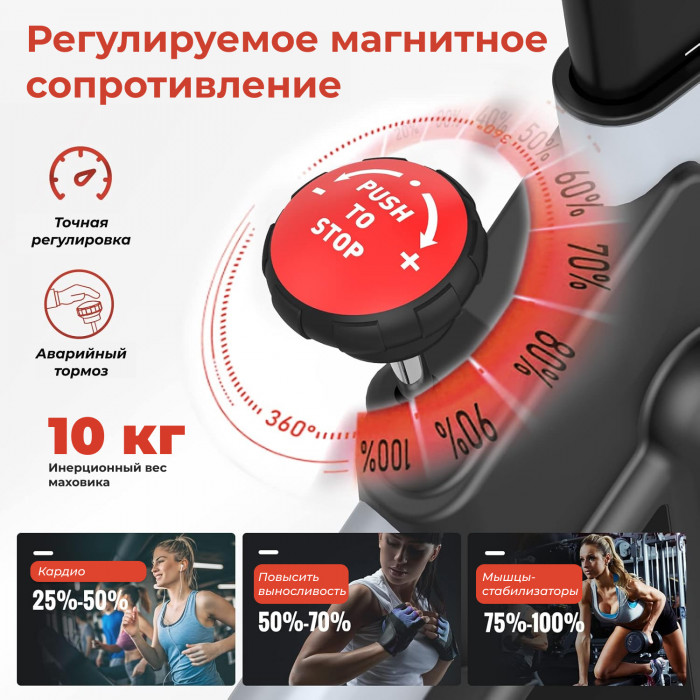Модель рассчитана на пользователей весом до 135 кг. Тренажер оснащён магнитной системой нагрузки с инерционным весом маховика 10 кг и механической регулировкой. Благодаря бесступенчатой системе изменения сопротивления, вы можете плавно повышать или снижать уровень сложности, выбирая оптимальный режим для кардиотренировки, сжигания жира или развития выносливости.