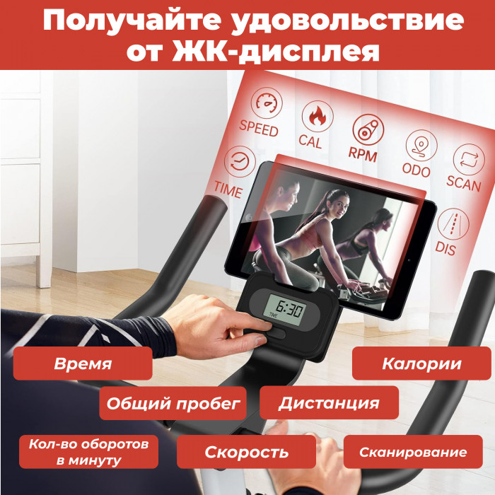 Велотренажер имеет монохромный LCD-дисплеей, который отображает ключевые параметры тренировки: время, калории, дистанцию, скорость, сканирование и пульс. Это позволит отслеживать прогресс и корректировать нагрузку в реальном времени. Для работы консоли используются батарейки типа AAA (2 шт), которые входят в комплект - удобно и не требует подключения к сети.