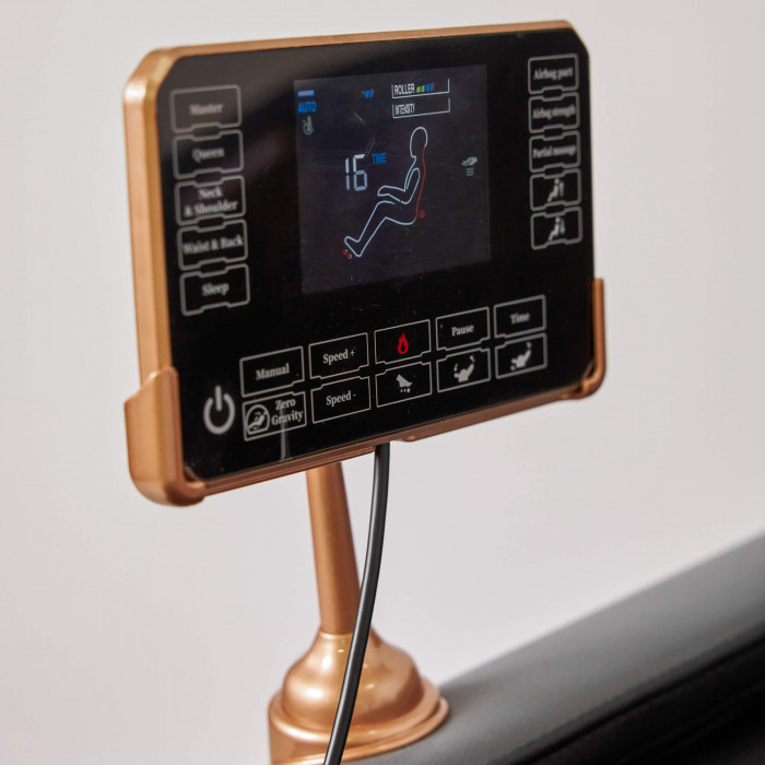 регулировка интенсивности: массажа на 3 уровнях, интенсивности давления воздуха на 3 уровня и времени на 3 уровнях; регулировка подъема голеней, подъема спинки, автоматическая регулировка угла наклона кресла в режиме Zero Gravity; подставка для голеней оснащена функцией телескопической регулировки, высота подножки определяется в зависимости от длины ног пользователя