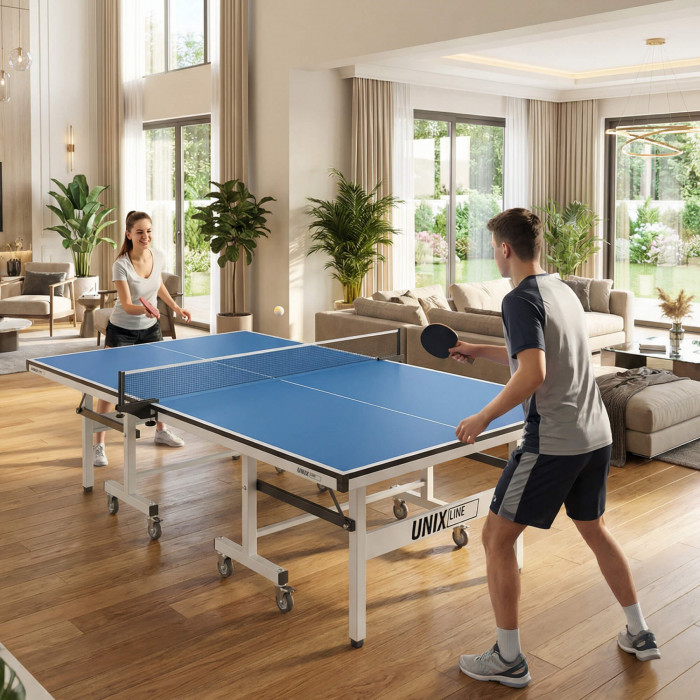 Уникальный синий цвет теннисного стола UNIX Line сразу притягивает внимание своим стильным и современным видом. Благодаря этому, он станет неотъемлемым элементом вашего интерьера, придавая ему изысканность и выделяясь среди других предметов спортивного оборудования.