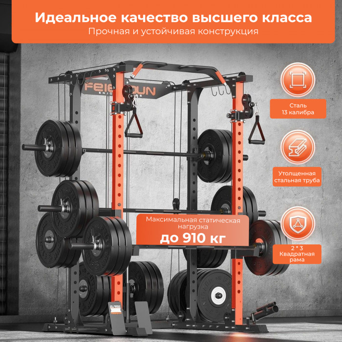 Максимальный вес пользователя составляет до 120 кг, что обеспечивает безопасную и комфортную эксплуатацию тренажёра для пользователей разного уровня подготовки. Рама имеет прочный профиль и посадочный диаметр, а толщина тросов и рукояти для тяги обеспечивают надёжность и стабильность при выполнении упражнений.