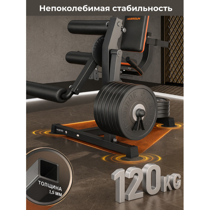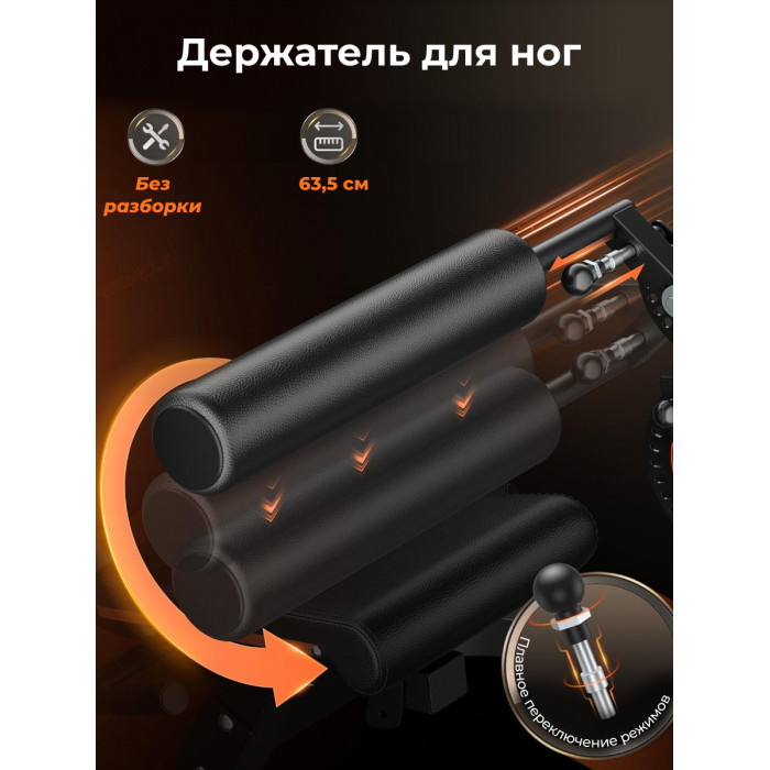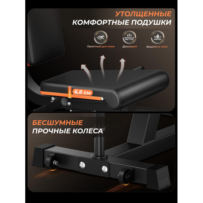 Тренажёр оснащён прочной рамой и качественной обивкой, что гарантирует долговечность и комфорт даже при регулярных занятиях. Эргономичный дизайн обеспечивает правильное положение тела во время упражнений, снижая нагрузку на суставы и спину, а плавная регулировка всех элементов позволяет адаптировать тренажёр под индивидуальные потребности каждого пользователя.
