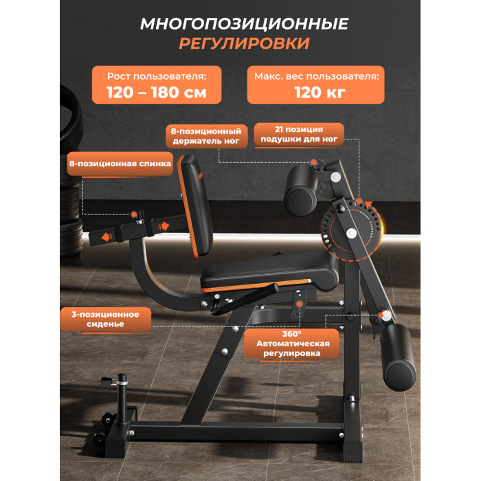 Максимальный вес пользователя составляет до 120 кг, что обеспечивает безопасную и комфортную эксплуатацию тренажёра для людей разного уровня подготовки. Спинка регулируется в 8 положениях, а сиденье — в 3 режимах. Индивидуальная настройка тренажера обеспечивает максимальный комфорт и эффективность. Большой диск для регулировки угла наклона руки и ноги имеет 21 уровень, а меньший диск на - 8 уровней.