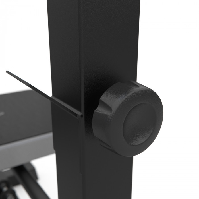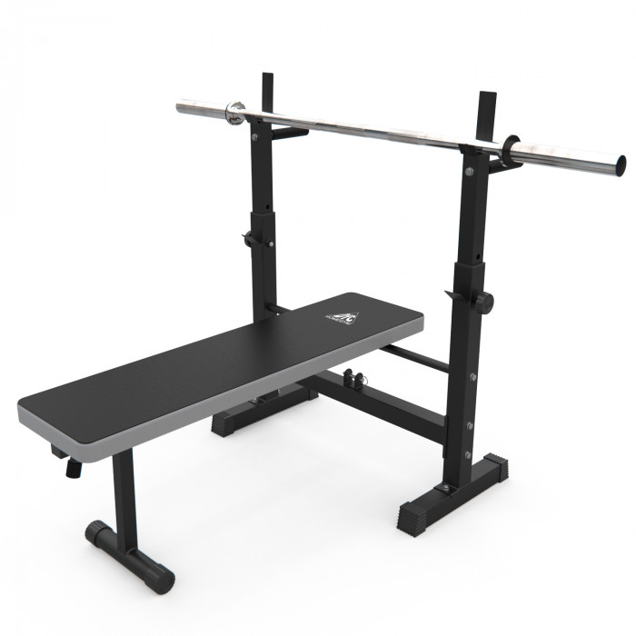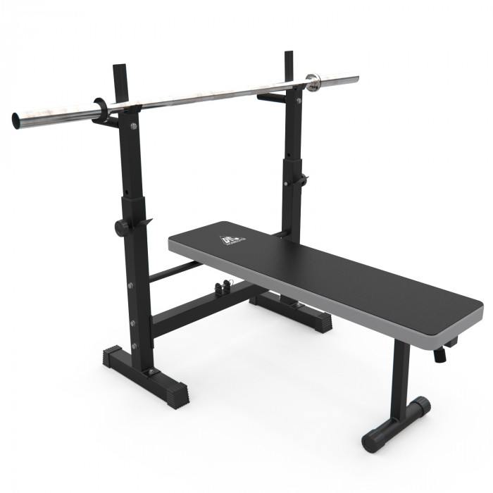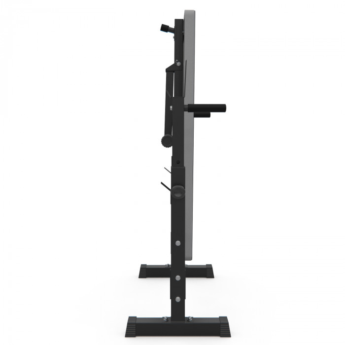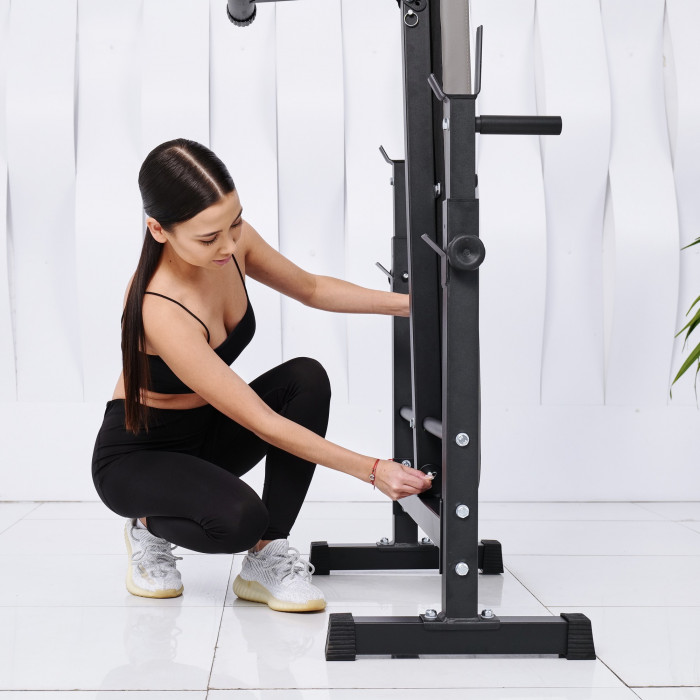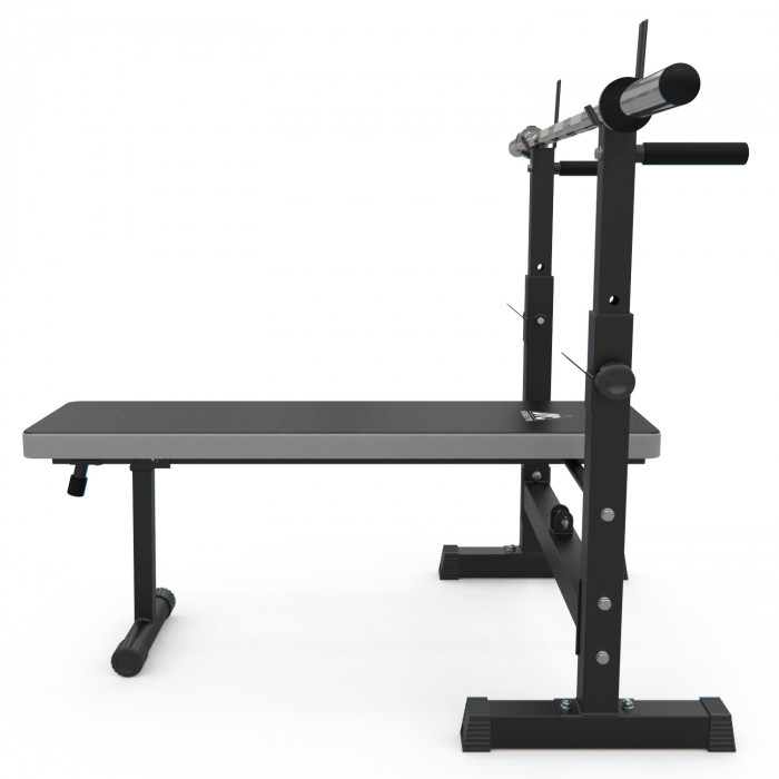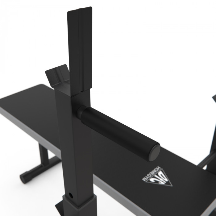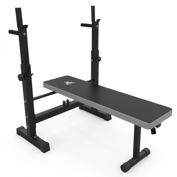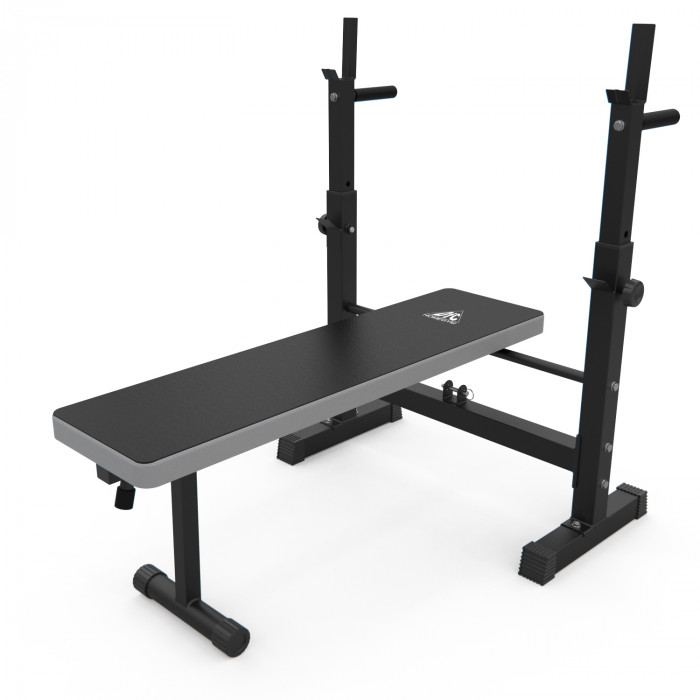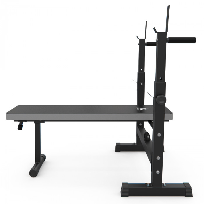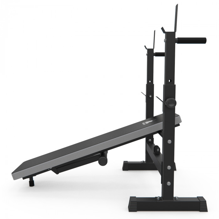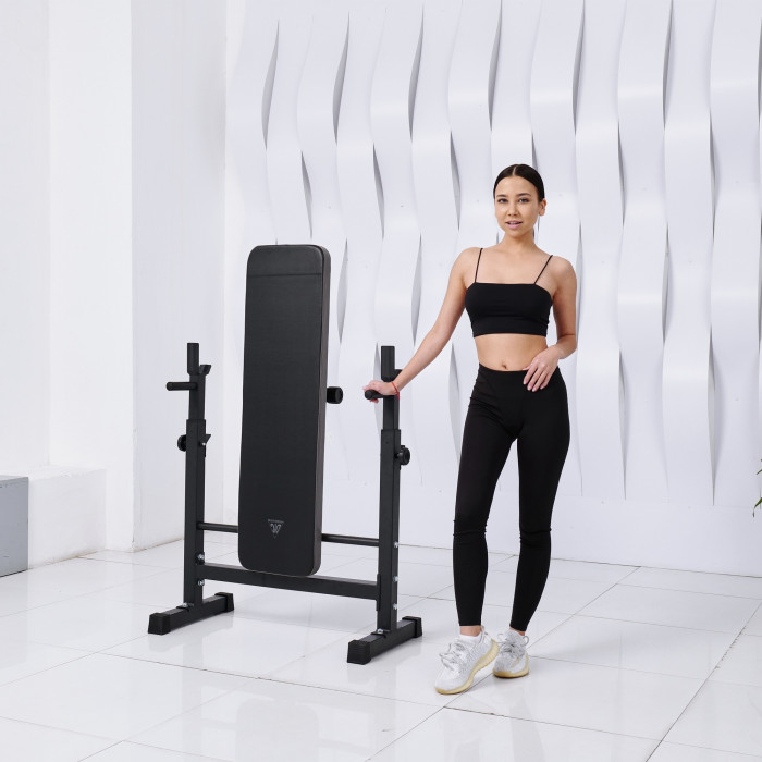 Изготовлена из прочного и долговечного материала, эта скамья предлагает безупречную комбинацию стиля и функциональности. Ее регулируемые стойки под штангу позволяют настраивать высоту под ваши требования и комфорт, гарантируя максимальную безопасность в процессе выполнения упражнений.
