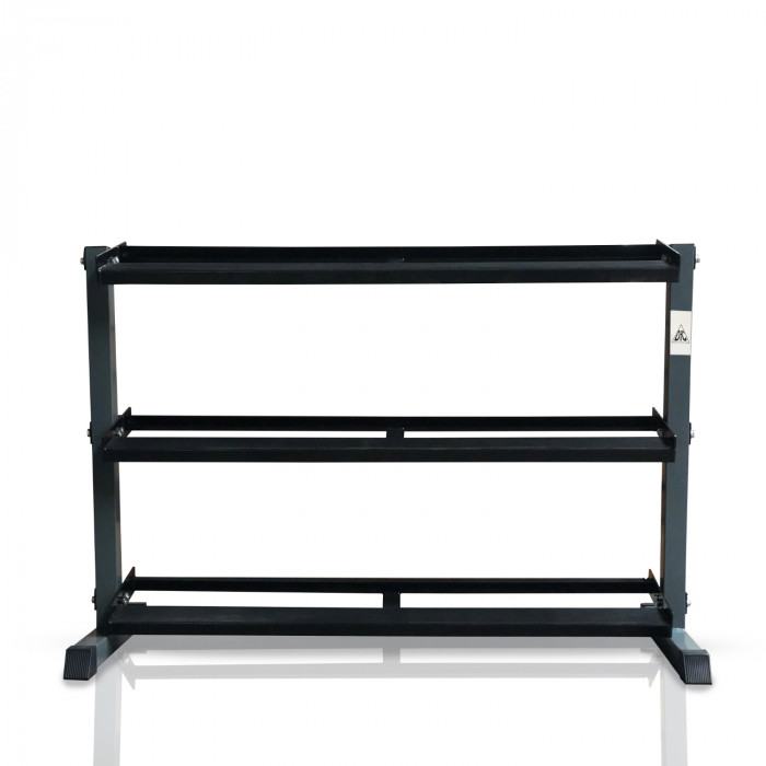Стойка для хранения профессиональных гантелей DFC из серии POWERGYM RA070 чёрного цвета с серым корпусом для домашнего использования.