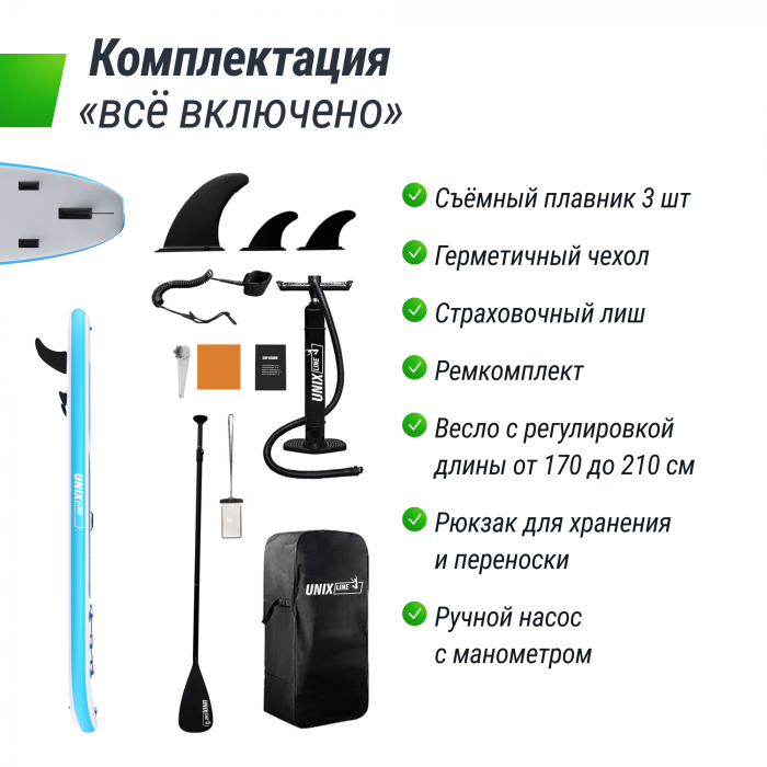 Доска и весло, 3 съемных плавника, непромокаемый чехол для телефона и документов, страховочный лиш, ключ для замены клапана, заплатка на случай пореза, насос с монометром, эластичный шнур на доске для хранения вещей, рюкзак для хранения, подстаканник