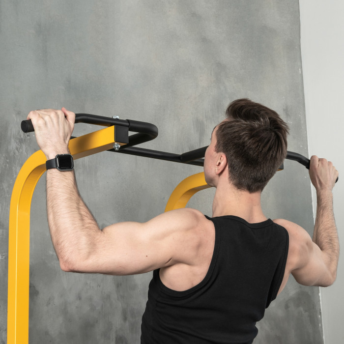 Брусья с подлокотниками можно отрегулировать по высоте в трех положениях. Или снять их полностью, и в этом случае они не мешают выполнять подтягивания.