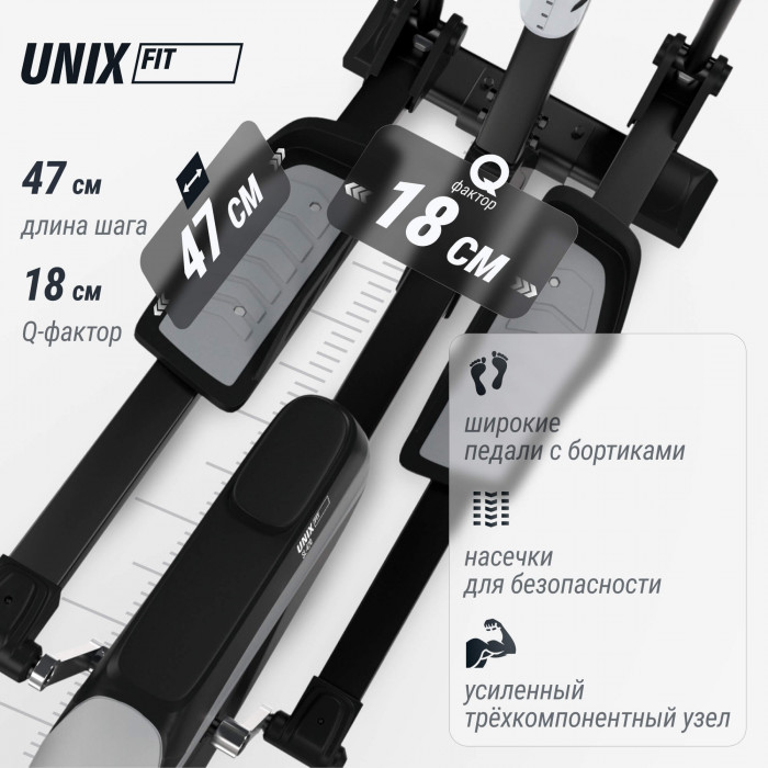 Магнитный эллиптический тренажер UNIX Fit SL-470 обладает усиленным трехкомпонентным педальным узлом и мощной рамой. Длина шага данной модели составляет 47 сантиметров, а расстояние между педалями (Q фактор) составляет всего 18 сантиметров.