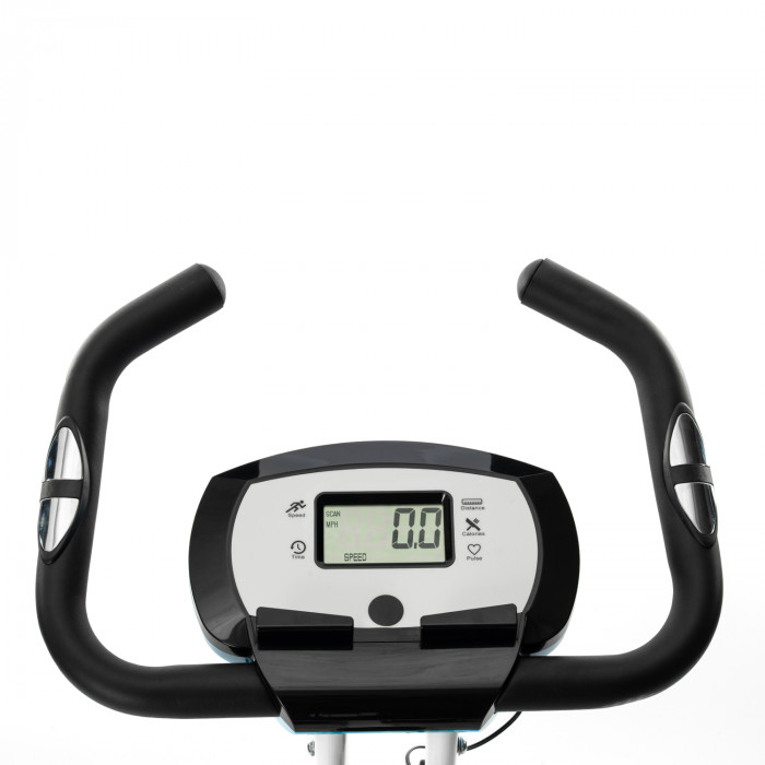 Тренажёр оснащён монохромным LCD-дисплеем, который отображает все основные параметры тренировки: время, дистанцию, скорость, калории и пульс. Измерение пульса осуществляется с помощью сенсорных датчиков, встроенных в поручни — это позволяет контролировать интенсивность нагрузки и корректировать тренировку в зависимости от уровня подготовки. Дисплей работает от двух батареек типа AAA (в комплект не входят). Дополнительно предусмотрена подставка под планшет, чтобы можно было смотреть видео или слушать музыку во время занятия.