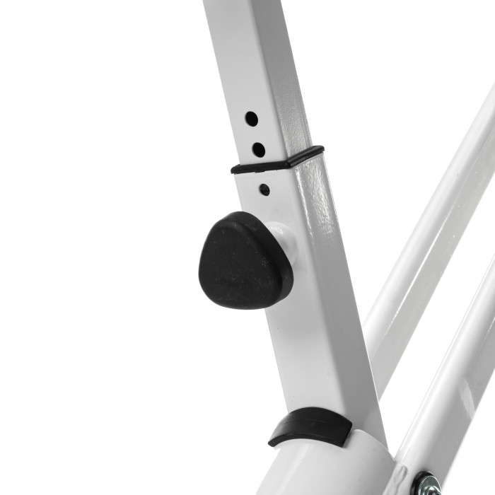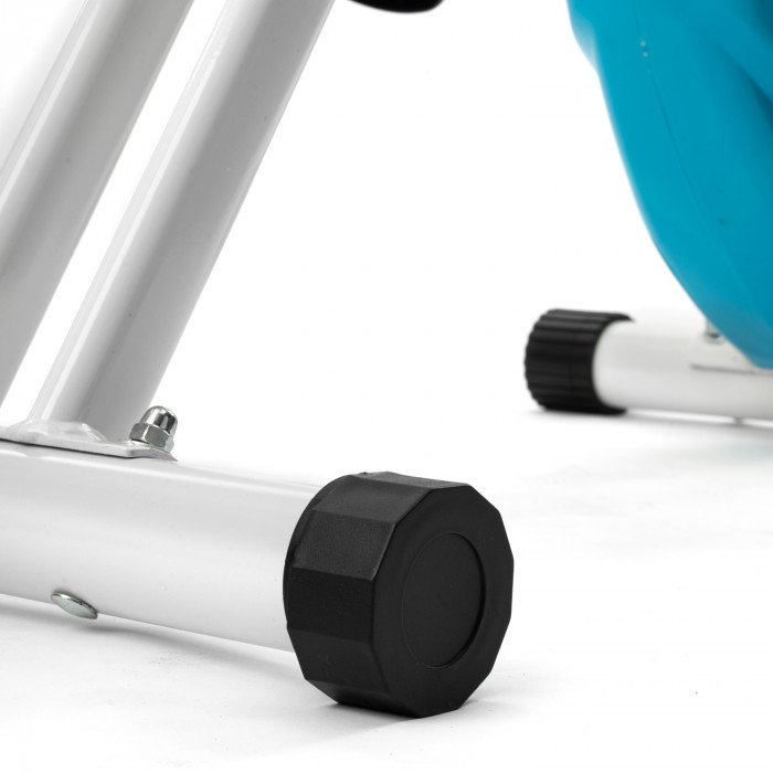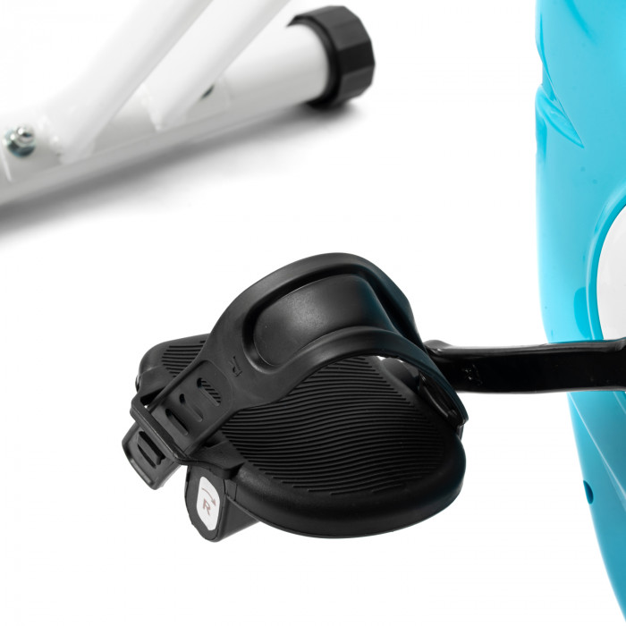 Педали оснащены фиксирующими ремнями, обеспечивая надёжную постановку стопы и безопасность во время занятий. Складная конструкция позволяет компактно хранить тренажёр после использования — модель не занимает много места и отлично подходит даже для небольших помещений. Для удобного перемещения предусмотрены транспортировочные ролики.