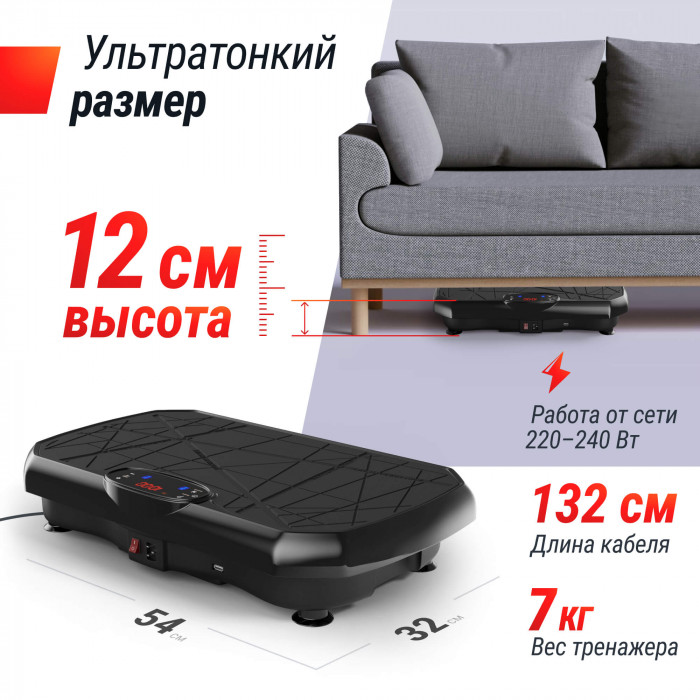 Виброплатформа, кабель питания, пульт управления, эластичный трос (2 шт.), руководство пользователя